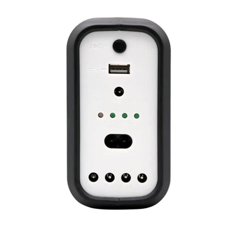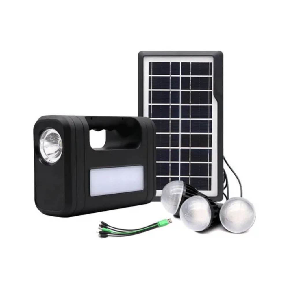 Con este Kit Panel Solar, puedes conectar tres bombillos para que ilumines tu hogar, finca, bodega, o el lugar que necesites. También puedes recargar tu celular o tablet, incluye cable multiusos para cargar una gran variedad de dispositivos. Puedes recargar la batería del kit, conectándola a la corriente eléctrica o poniendo el panel al sol. Además cuenta con una potente linterna incorporada para que nunca te falte luz.